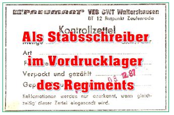 Ich war Stabsschreiber im Kfz-Regiment 2 in Strausberg. Viel Alltag bestand aus Listen, Meldungen, Schreibmaschinenklappern u.v.m. Unter anderem hatte ich die Schlüssel für das Vordrucklager des Regimentes. Das Lager lag gleich hinter dem Kompaniegebäude. Von außen unscheinbar – drinnen eine eigene Welt: hohe Regale, sauber aufgereiht, endlose Stapel an Formularen. Alles, was eine Armee in Friedenszeiten und Übungen an Papier braucht: Marschbefehle, Materialanforderungen, Meldungen, Übergabeprotokolle, Nachweise. Ordentlich, nüchtern, nahezu beruhigend.
