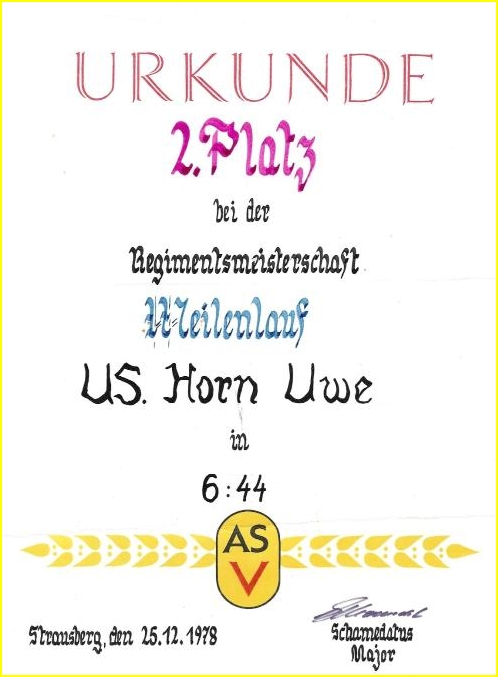 Normalerweise sollte der erste Urlaub für uns Unteroffizierschüler erst im neuen Jahr, Februar 1979, sein. Es gab allerdings zu Weihnachten 1978 eine sogenannte Regimentsmeisterschaft ‚Meilenlauf‘. Jede Kompanie hatte dazu einen (oder mehrere Teilnehmer?) zu stellen. Ob ich mich zu diesem Lauf freiwillig meldete oder delegiert wurde, kann ich heute nicht mehr sagen. Jedenfalls fand dieser Meilenlauf am ersten Weihnachtsfeiertag statt. Start und Ziel dieses Laufes war vor dem Stabsgebäude. Die Streckenführung des Laufes führte rechts am Stabsgebäude vorbei. Dann die Straße Richtung Exerzierplatz und wieder zurück zu Start und Ziel. Diese Strecke musste ungefähr 8 oder 9 Mal zurückgelegt werden. Mit meiner Zeit von 6 Minuten und 44 Sekunden belegte ich letztendlich den zweiten Platz.