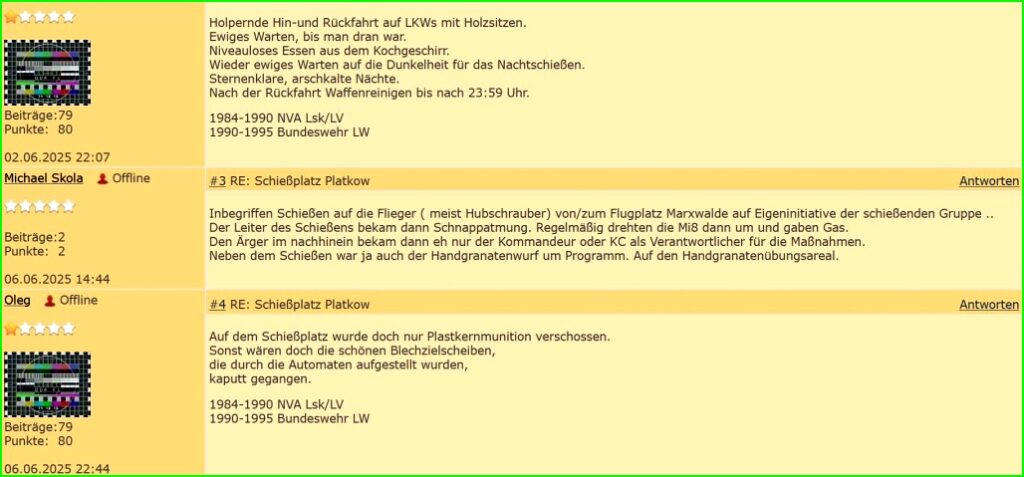 Das Schießen ging ziemlich zügig. Aber auf die Ergebnisse kam es ja an. Es gab zwei Totalausfälle, beide Scheiben blieben unversehrt und man merkte dem Zugführer den Ärger an, vom Kompaniechef ganz zu schweigen der stand kurz vorm Explodieren. Aber es wurde doch noch gut! Es wurden gute bis sehr gute Ergebnisse erzielt. In meiner gesamten Zeit in der NVA habe ich dieses Erlebnis zweimal gehabt. Zweimal Schießen mit MPi und mehrmals mit Pistole in der Nähe von Strausberg .