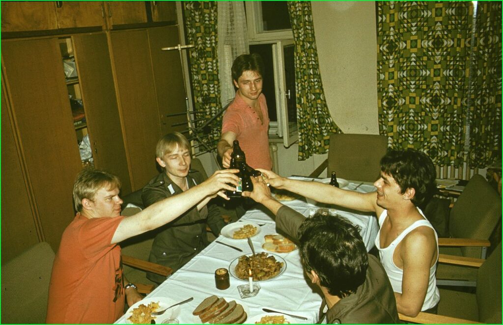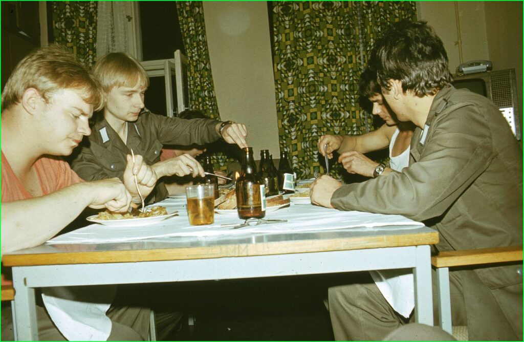 Guten Appetit! Hier schmeckt es besser, als in der Mannschaftskantine. Hoffentlich kommt nicht der OvD! Zweiter von links ist H-P. Nicolai.