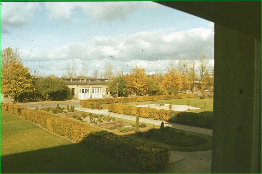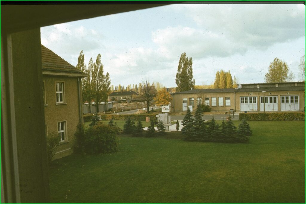 Hernst 1980, Blick aus dem OG des Stabsgebäudes Richtung PKW-Lackierung, jetzt Werkstatt von Ford-Müller, rechts sichtbar Springbrunnen.