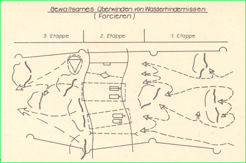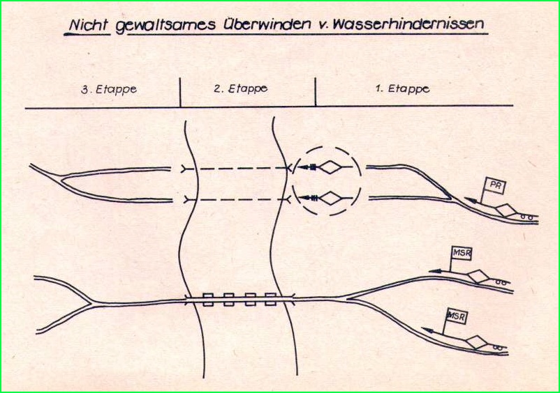 Ich weiß nicht mehr, waren wir an einem Fluss oder einem anderen Gewässer? Nun, unterhalb der Anhöhe war ein ganz schöner Auflauf und Wasser war zu sehen und Wald. Zwei oder drei Schlauchboote und Taucher mit ihrer Ausrüstung waren zu sehen, Pfähle waren eingeschlagen und Bergepanzer standen bereit, denn es sollte eine